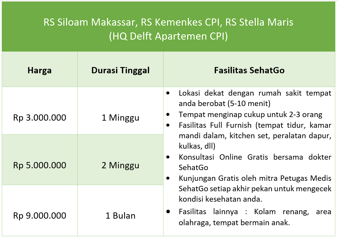 Kami menyediakan apartemen tempat menginap yang berdekatan dengan lokasi anda berobat dengan tarif sebagai Berikut.