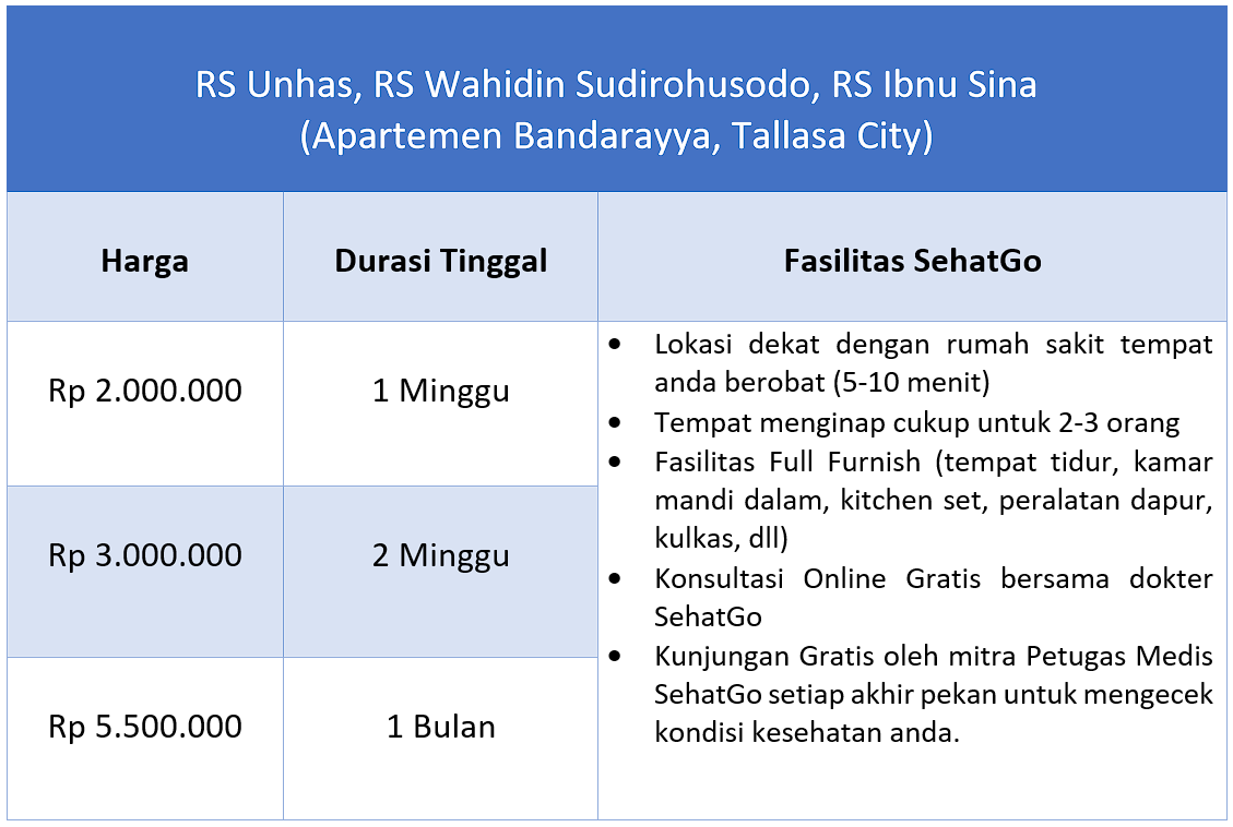 Kami menyediakan apartemen tempat menginap yang berdekatan dengan lokasi anda berobat dengan tarif sebagai Berikut.